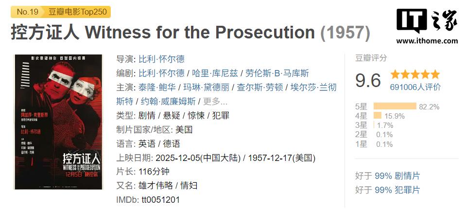 IT之家 11 月 21 日消息河南配资公司,电影《控方证人》于今日官宣定档 12 月 5 日在内地上映,该电影于 1957 年首次在美国上映,当前豆瓣评分高达 9.6,位列豆瓣电影 Top250 排行榜第 19 名。